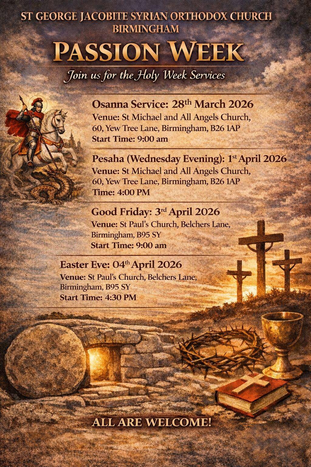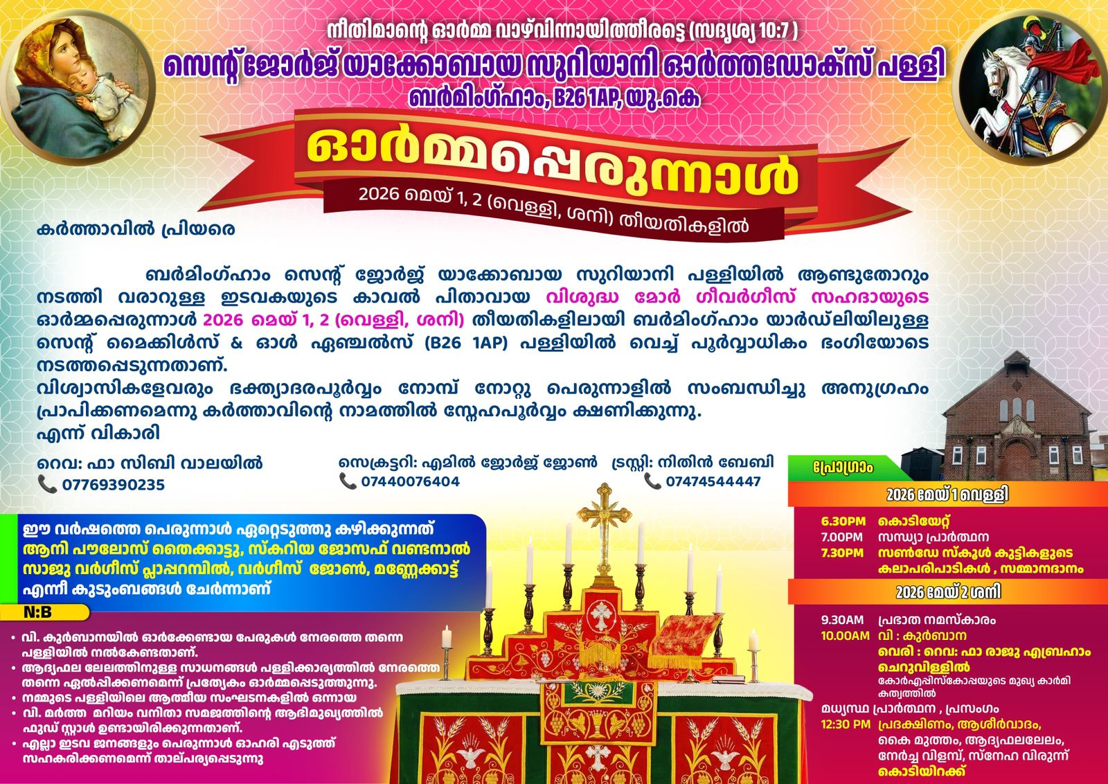 St. George Jacobite Syrian Orthodox Church, Birmigham belongs to the Universal Syrian Orthodox Church under the Patriarch of Antioch and all the East. It is administered by UK diocese of Malankara Archdiocese of Universal Syriac Orthodox Church (Malankara Jacobite Syrian Christian Church)
